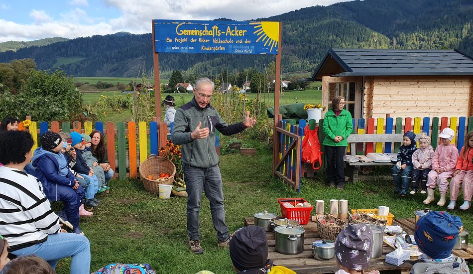 Der Volkshilfe Kindergarten Spatzennest in Pöls feierte am 1. Oktober 2025 ein Suppenfest als Erntedank am Kindergarten- und Schulacker in Pöls-Oberkurzheim.