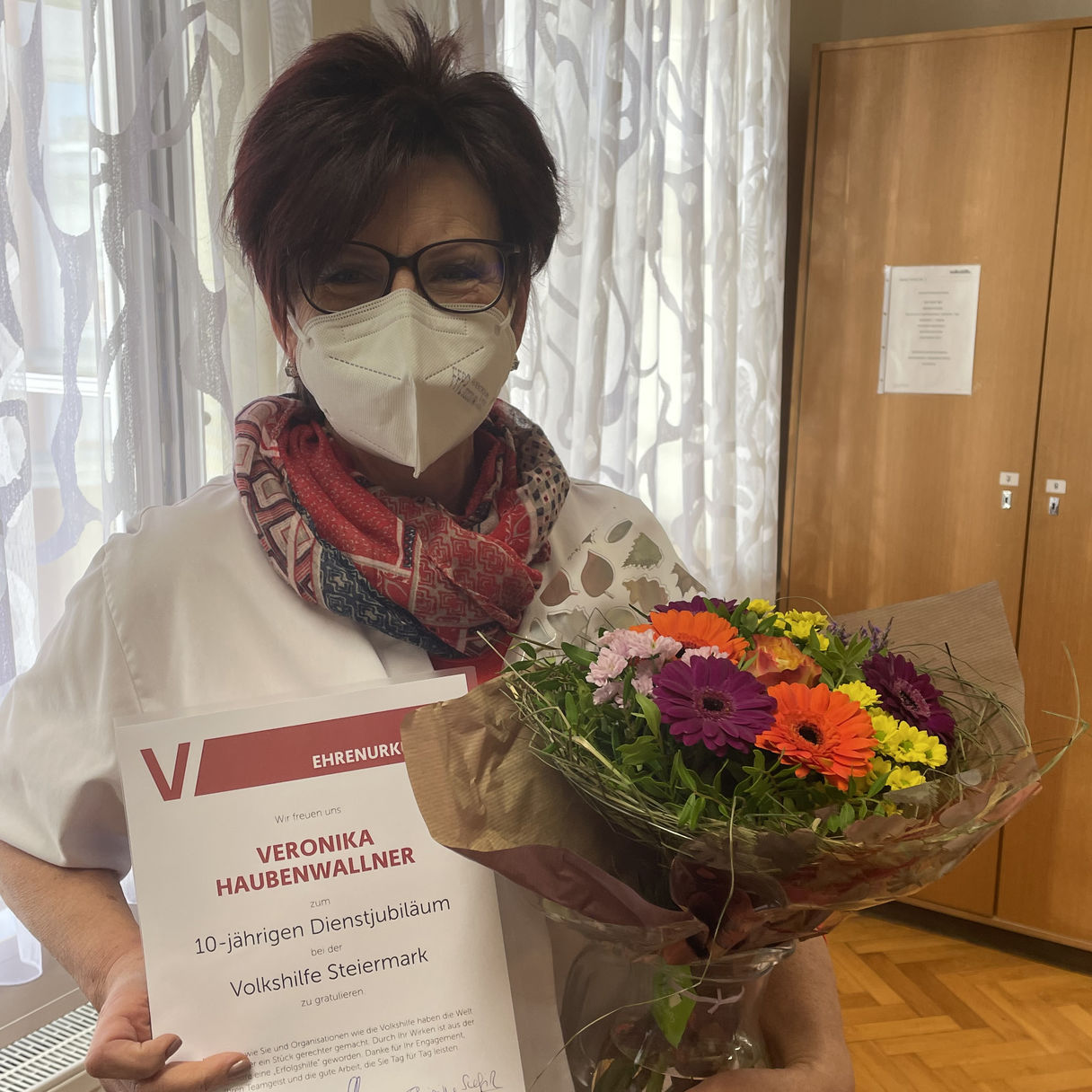 Veronika Haubenwallner ist bereits seit 10 Jahren DGKP im Sozialzentrum Mürzzuschlag, ihre Loyalität zur Volkshilfe und ihr Engagement für die KundInnen ist seit Anfang an ungebrochen sind sich Einsatzleiterin Daniela Königsberger-Ellmaier und Sozialzentrumsleiter Oskar Freund einig.