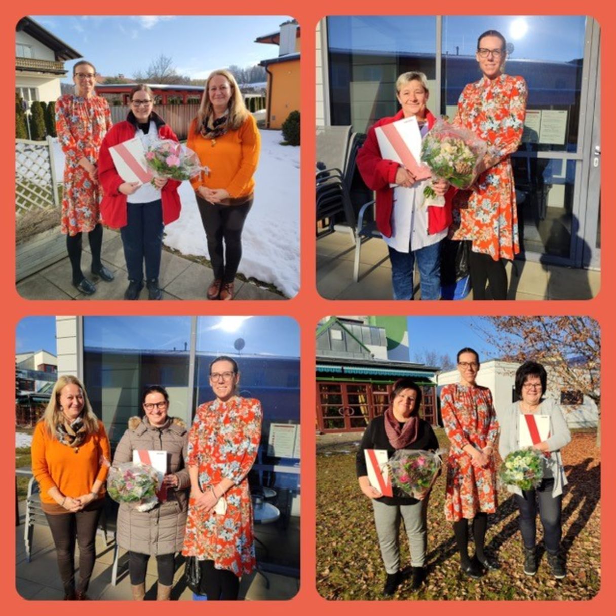 Gleich fünf KollegInnen wurden kürzlich im Sozialzentrum Deutschlandsberg geehrt: Pflegeassistentin Sabrina Peißer – 10 Jahre, Heimhilfe Ulrike Wedenig – 30 Jahre, Heimhilfe Yvonne Ehmann – 25 Jahre, Wohnbetreuerin Waltraud Kappaun – 10 Jahre und Heimhilfe Angela Prattes – 25 Jahre (im Uhrzeigersinn).