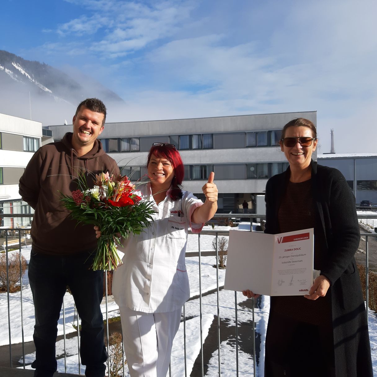 Zumra Dolic arbeitet seit mittlerweile 22 Jahren in der Pflege davon 20 Jahre im Volkshilfe Seniorenzentrum in Liezen. Hausleiterin Iris Strohmeier und Pflegedienstleiter Thomas Ablasser gratulierten "Su" am 1. Advent zum zwei Jahrzehnte währenden Engagement.