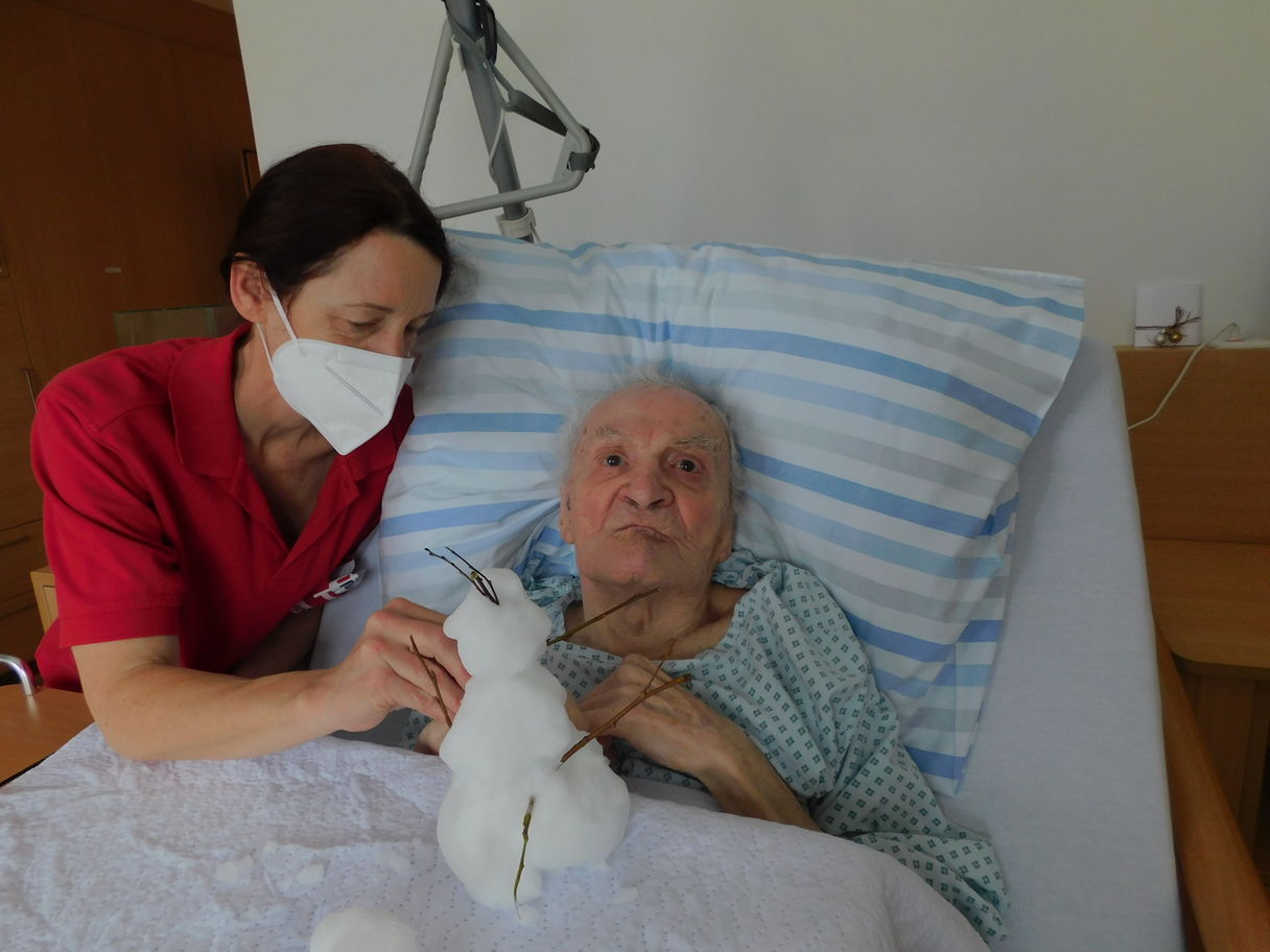 Wenn die BewohnerInnen nicht zum Schnee kommen können, dann kommt der Schnee zu den BewohnerInnen ins Zimmer, dachten sich einige MitarbeiterInnen und so war es auch. Sie brachten den Schnee ins Heim. Die BewohnerInnen hatten sichtlich Spaß am Bauen der Schneemänner und an der Schneeballschlacht über die Tische und Betten.