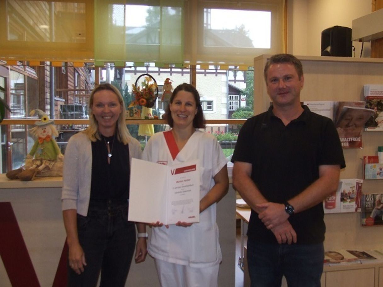 Auf dem Foto: Jubilarin Marion Hutter mit Hausleiter Alexander Grüner und Pflegedienstleiterin Elisabeth Purkarthofer.
