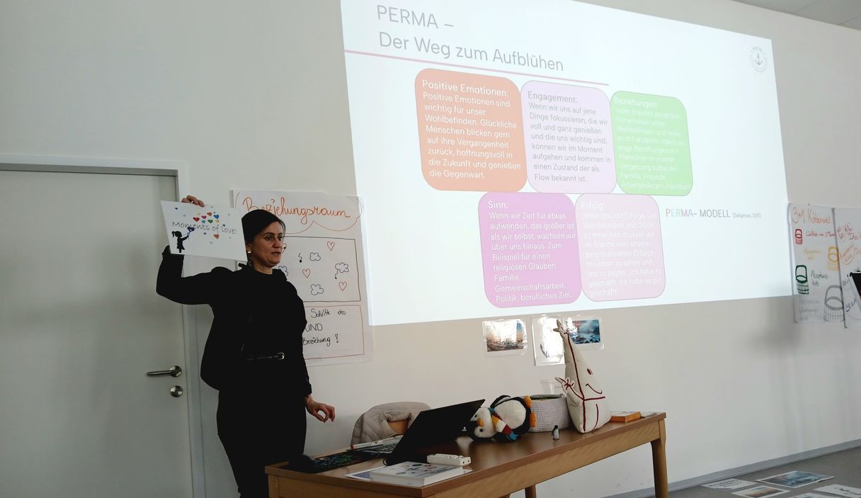 Unter diesem Motto fand kürzlich eine innovative Inhouse Fortbildung für alle Mitarbeiterinnen aus den Einrichtungen sowie von unseren Tageselternstandorten im Bezirk Liezen statt. Natascha Hodanek-Zimmermann ist mittlerweile langjährige Partnerin der Volkshilfe, wenn es um die Vermittlung von Inhalten zur neuen Autorität nach Heim Omer und Positiver Psychologie geht. Sie begeisterte unsere Mitarbeiterinnen mit einem bunten Mix aus Stärkenorientierung, positiven Fokus auf die Themen Dankbarkeit und Beziehungsgestaltung, anregenden Diskussion über das so wichtige Thema der Haltung im Hinblick auf den Kinderschutz und Vermittlung von Basiswissen aus dem PERMA-Lead Modell nach Dr. Markus Ebner.